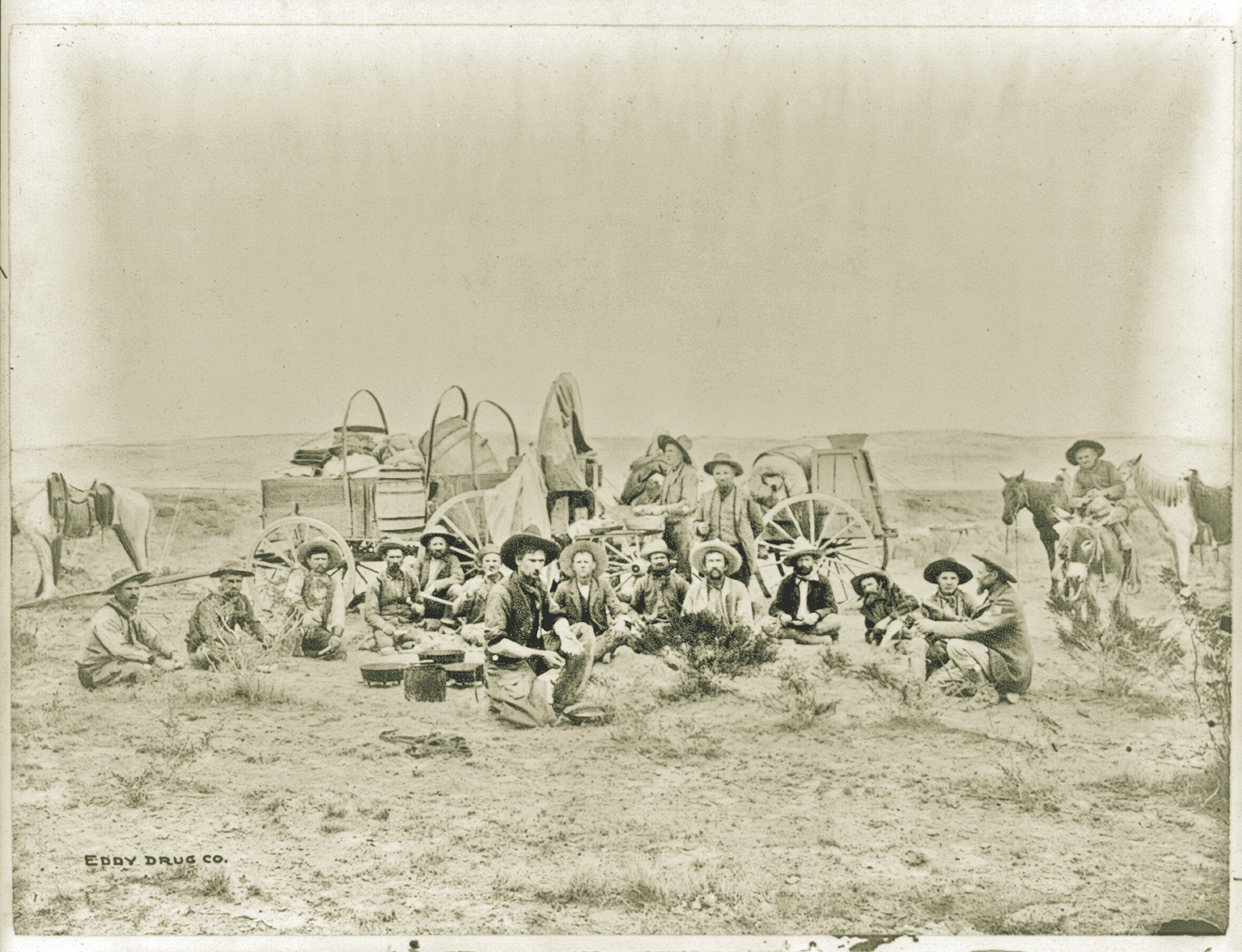 Cowboy hats are as individual as the cowboys who wear them, as demonstrated by this hungry group of hands sitting down for an evening meal around their chuckwagon. Courtesy Library of Congress