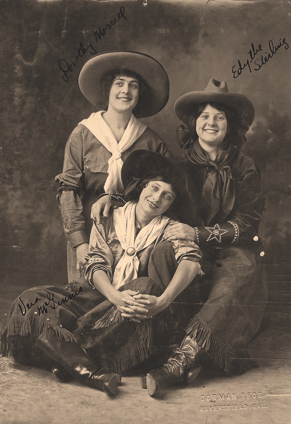A champion rodeo star in the 1920s and early 1930s, Vera McGinnis (front, center) and two of her rodeo circuit friends sport their favorite hats, boots and Western wear, all of which are back in fashion today. Courtesy True West Archives
