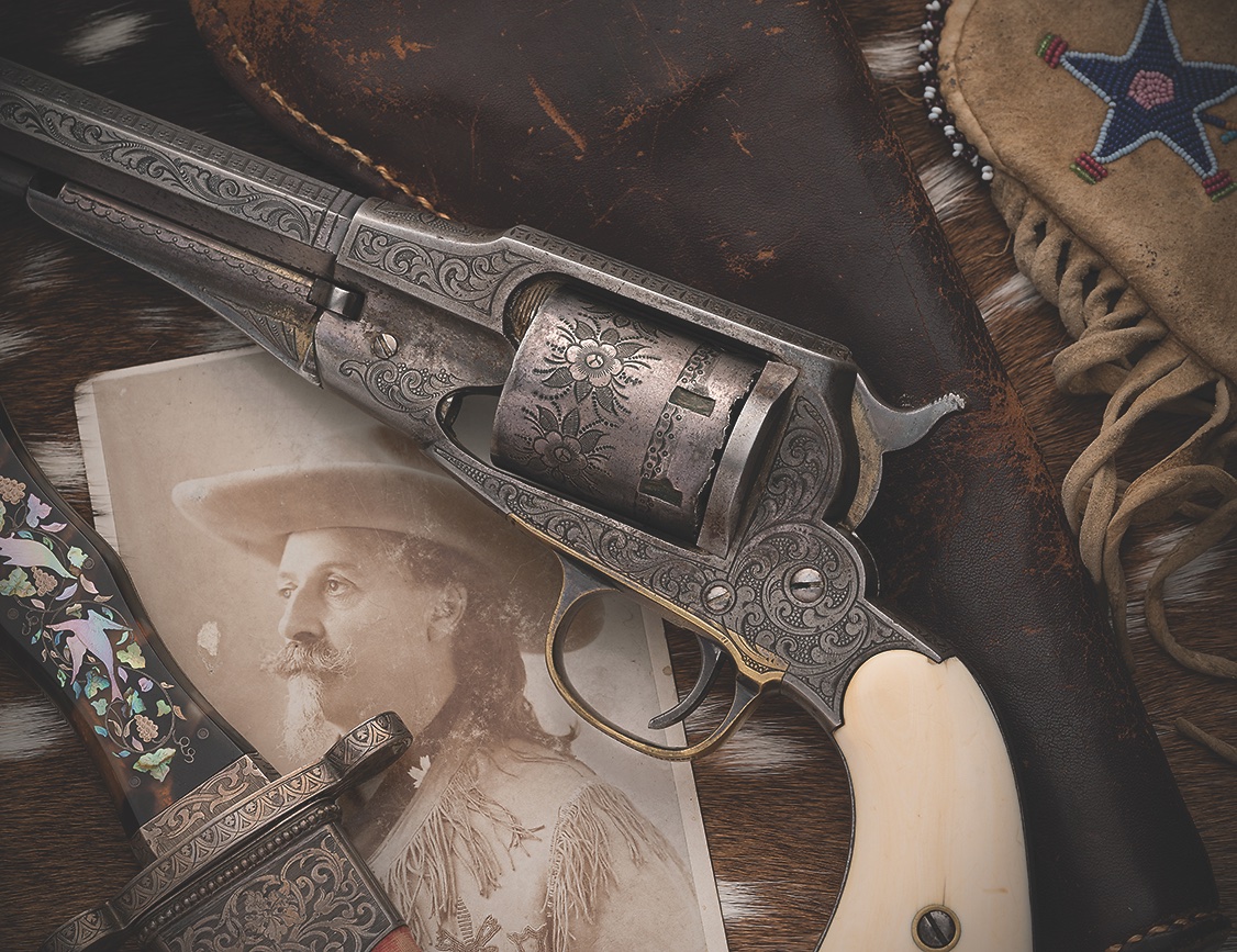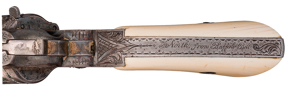 James Butler “Wild Bill” Hickok’s Smith and Wesson Model 2 Army revolver was presented at the auction with extensive provenance. That included information suggesting it was on him when he was killed in 1876, just two years after he performed onstage with Cody in Buffalo Bill’s Combination. The revolver brought $235,000. Frank North’s reputation was overshadowed by that of his friend Buffalo Bill, yet he too was an important scout during the Indian Wars. His Remington “Improved New Model Navy” revolver was manufactured between 1870 and 1875. It was inscribed and presented to him by Cody, probably while North was with Buffalo Bill’s Wild West. Like the Hickock revolver, this firearm also had very strong provenance and sold for $49,938.